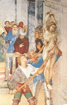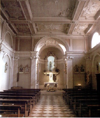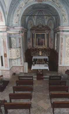 Aveva, in origine, l’abside orientata ad oriente: si vedono ancora non pochi affreschi del secolo XV, riscoperti nel 1953. Uno di essi reca un’iscrizione funebre in esametri latini con la data del 1473. Qualche graffito, pur di ardua lettura, sembra risalire al Trecento.S-Bartolomeo-Interno.jpg (85043 byte)