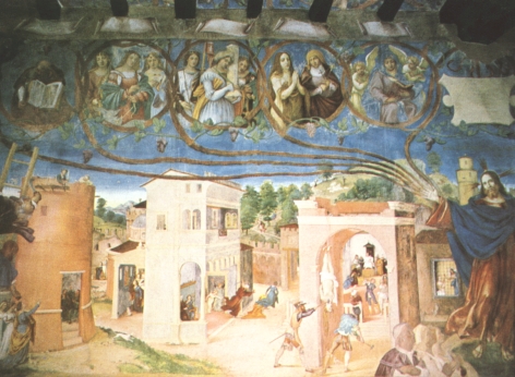 S-Barbara.jpg (154632 byte)Meglio conosciuta ormai quasi universalmente, come l’Oratorio Suardi, questa piccola chiesa, dal 1880 inglobata nel parco della villa dei conti Suardi, sorgeva lungo la strada che, attraverso la valle Cavallina e la valle Canonica, portava in Austria e in Germania. E’ stata costruita alla fine del secolo XV; il presbiterio fu dipinto nel 1502 da un anonimo pittore, forse della cerchia dei bergamaschi Scipioni; pareti e soffitto sono stati affrescati daS-Barbara1.jpg (146162 byte) Lorenzo Lotto, chiamato nel 1524 da Battista Suardi a dipingere le storie di santa Barbara, Brigida, Caterina di Alessandria e Maria Maddalena. Le storie, oggetto di numerose pubblicazioni dall’Ottocento a tutto il Novecento, con la loro simbologia, formano un vero e proprio trattato teologico per immagini, indirizzato, soprattutto, a confutare l’eresia protestante, che si affacciava S-Barbara3.jpg (68606 byte) anche da noi, attraverso gli eserciti tedeschi imperiali, che scendevano in quegli anni numerosi in Italia, con soste disastrose anche a Trescore, a causa delle guerre tra i vari sovrani del tempo. Particolare attenzione merita anche la volta, rappresentante una vigna (simbolo del popoli di Dio nell’antico e nel nuovo testamento), che prende origine dalle dita del grande Cristo al centro della parete di sinistra, rallegrata da putti variamente atteggiati; quei cherubi cantati da Gabriele d’Annunzio nelS-Barbara2.jpg (65249 byte) sonetto dedicato alla città di Bergamo. Il rivestimento esterno in cotto e marmo, il campaniletto e il portico sono aggiunte volute dal conte Gianforte Suardi alla fine dell’Ottocento, quando ha riedificato il palazzo e disegnato il grandioso parco. Nella stessa epoca sono stati collocati all’esterno due sarcofagi, di stile campionesse, uno dei quali con iscrizione funebre del 1330. Anche questa chiesa è riconosciuta come edificio monumentale.