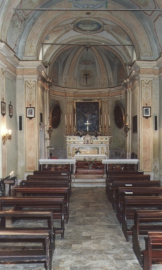 L’interno è affrescato dalla stessa mano che ha dipinto gli interni della vicina villa dei marchesi Terzi, nel secolo XVIII, ed è stato restaurato negli anni Sessanta del Novecento.