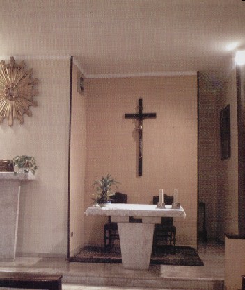 L’altare è in marmo carnicino e poggia su svelte colonnette; il soffitto è a cassettoni istoriati; ai lati del presbiterio sono due altorilievi in legno policromo, raffiguranti l’uno San Luigi Gonzaga che riceve la comunione da San Carlo Borromeo, l’altro San Francesco d’Assisi; lungo le paretiLourdes-2.jpg (56848 byte) della chiesa quattordici quadri, pure in legno dipinto, rappresentano i misteri del Rosario e provengono dalla bottega Rungaldier della Val Gardena e sono contemporanei della costruzione. Il pavimento è stato completamente rifatto nel 1986, come pure i banchi.